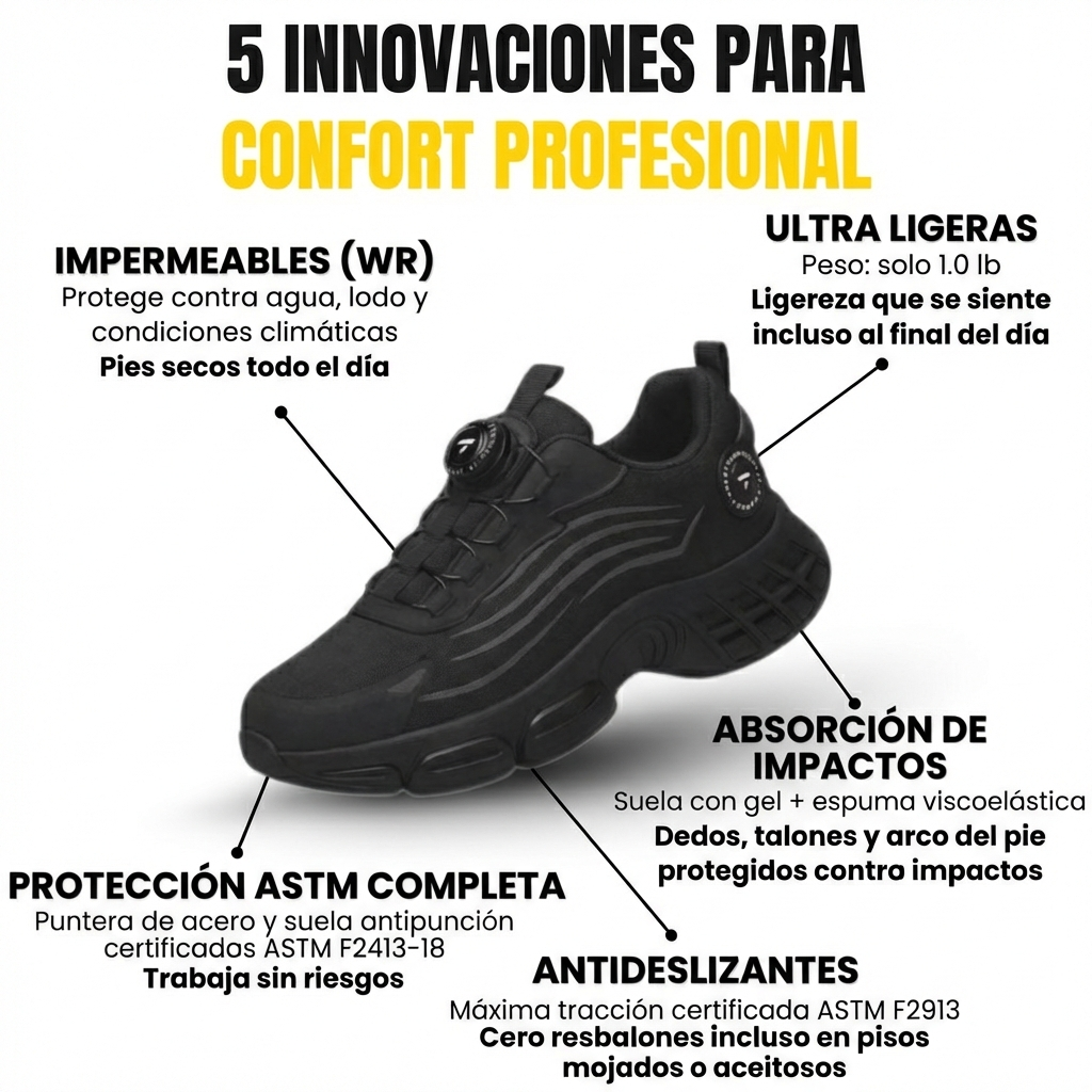 Aunque están diseñadas con la estética de una sneaker, nuestras zapatillas utilizan materiales industriales de alta resistencia: malla reforzada, costuras selladas y suela profesional antideslizante.